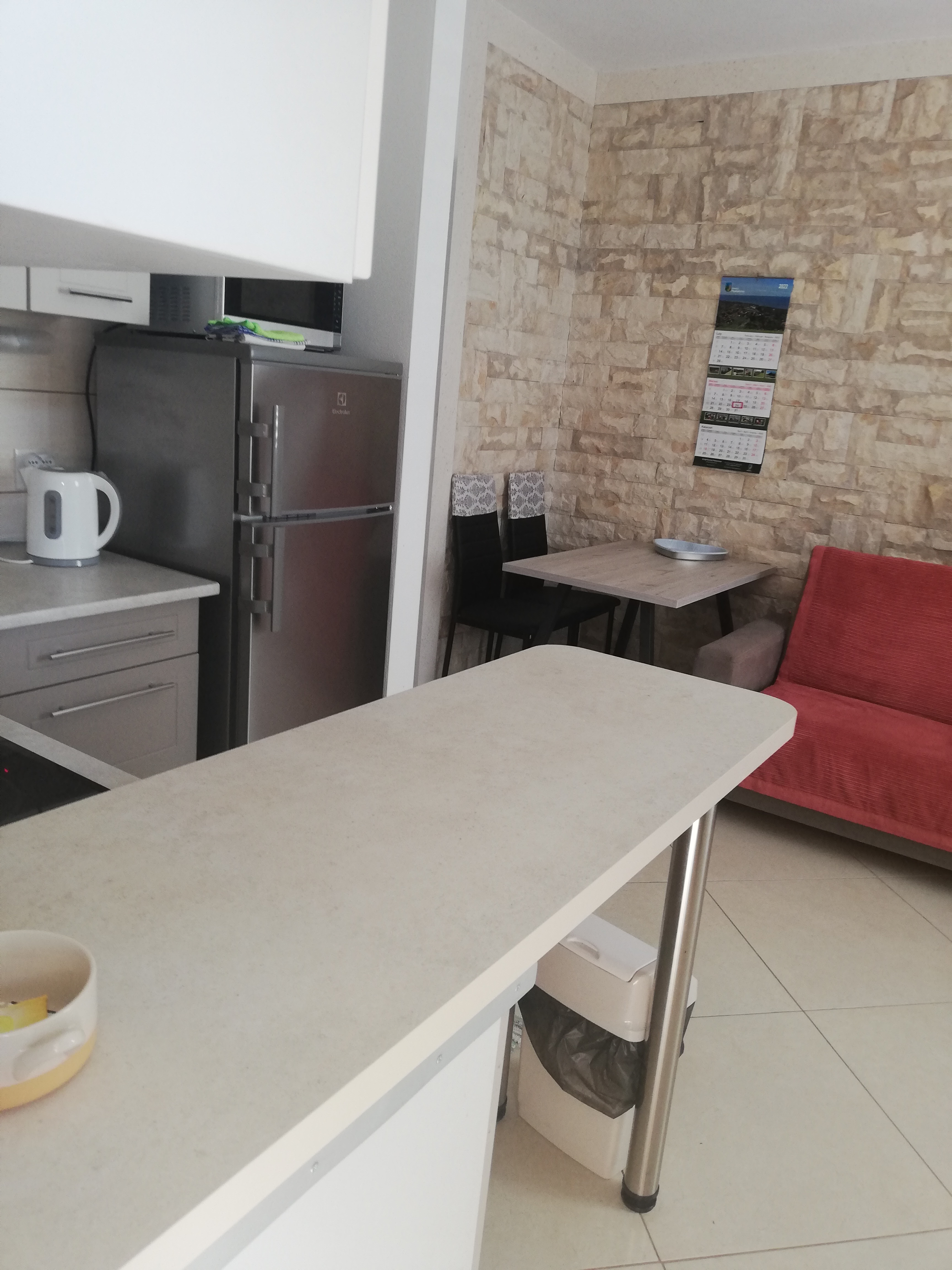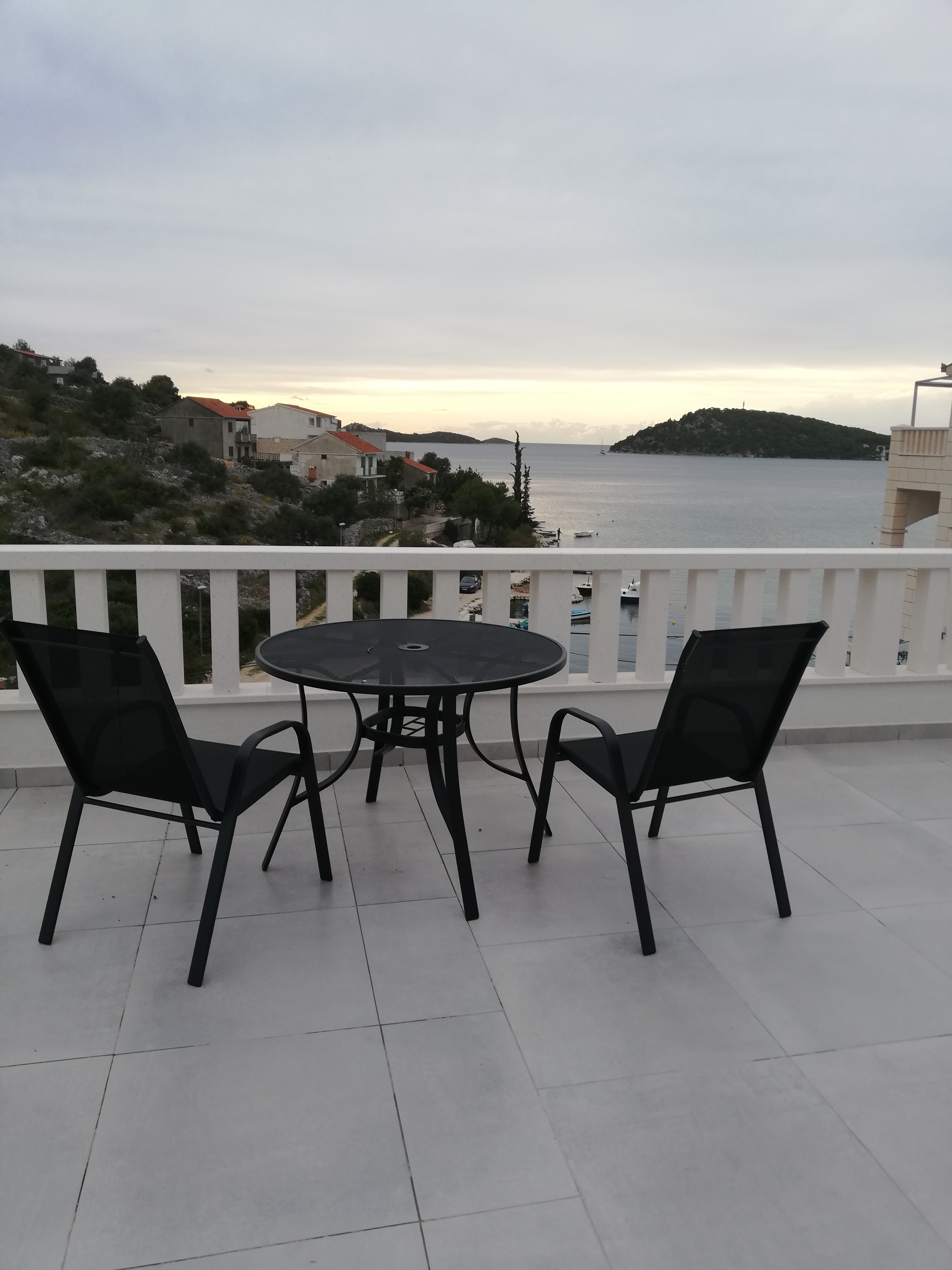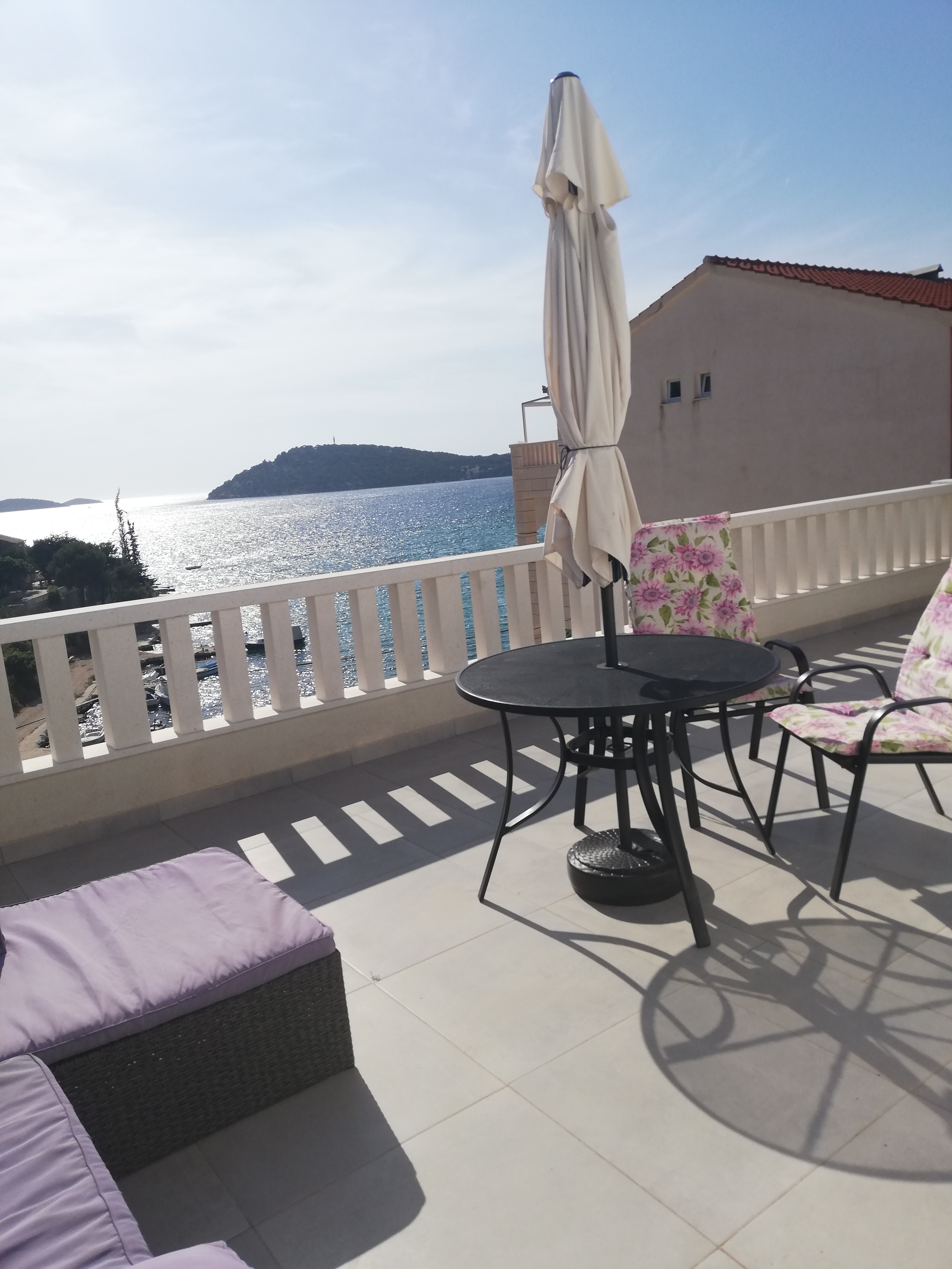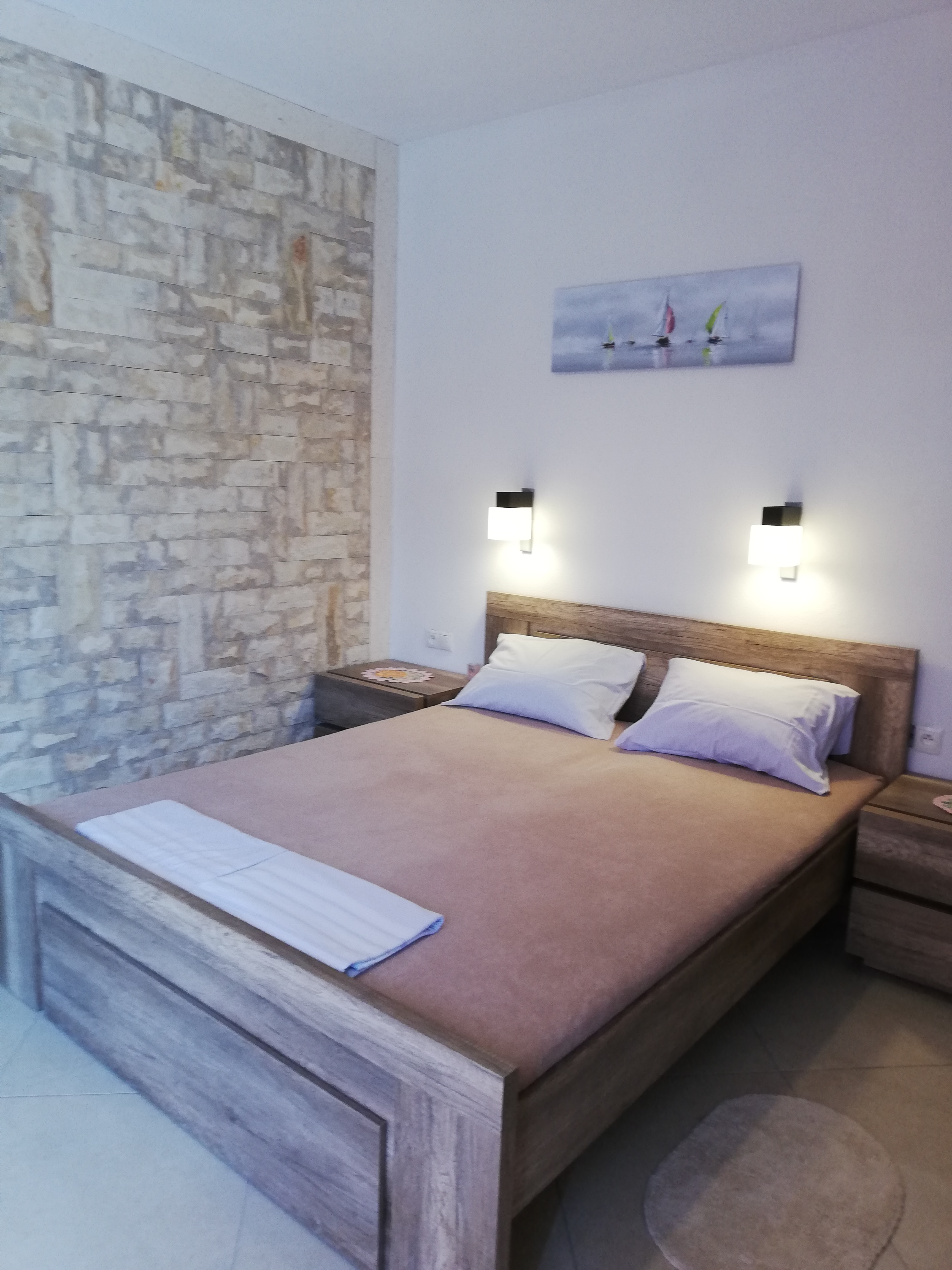 Zapraszamy do komfortowych, w pełni wyposażonych apartamentów z tarasem, skąd roztacza się piękny widok na morze. Każdy apartament składa się z salonu połączonego z aneksem kuchennym, sypialnią oraz łazienką. Salon wyposażony jest w TV, stół, krzesła, żaluzje zaciemniające duże okno z wyjściem na taras, oraz kanapę 2 osobową wraz z bielizną pościelową. Sypialnia posiada łóżko małżeńskie, bieliznę pościelową, stoliki nocne, szafę lub wieszak na ubrania wraz z komodą, klimatyzację. Kuchnia wyposażona jest w szafki, płytę kuchenną indukcyjną, zlewozmywak, mikrofalówkę, lodówkę, czajnik elektryczny, naczynia, sztućce, garnki. Łazienka posiada prysznic, wc, lustro, ręczniki, papier toaletowy. Tarasy z krzesełkami, stolikiem oraz parasolem, zapewni Państwu możliwość odpoczynku i napawania się klimatem śródziemnomorskim.